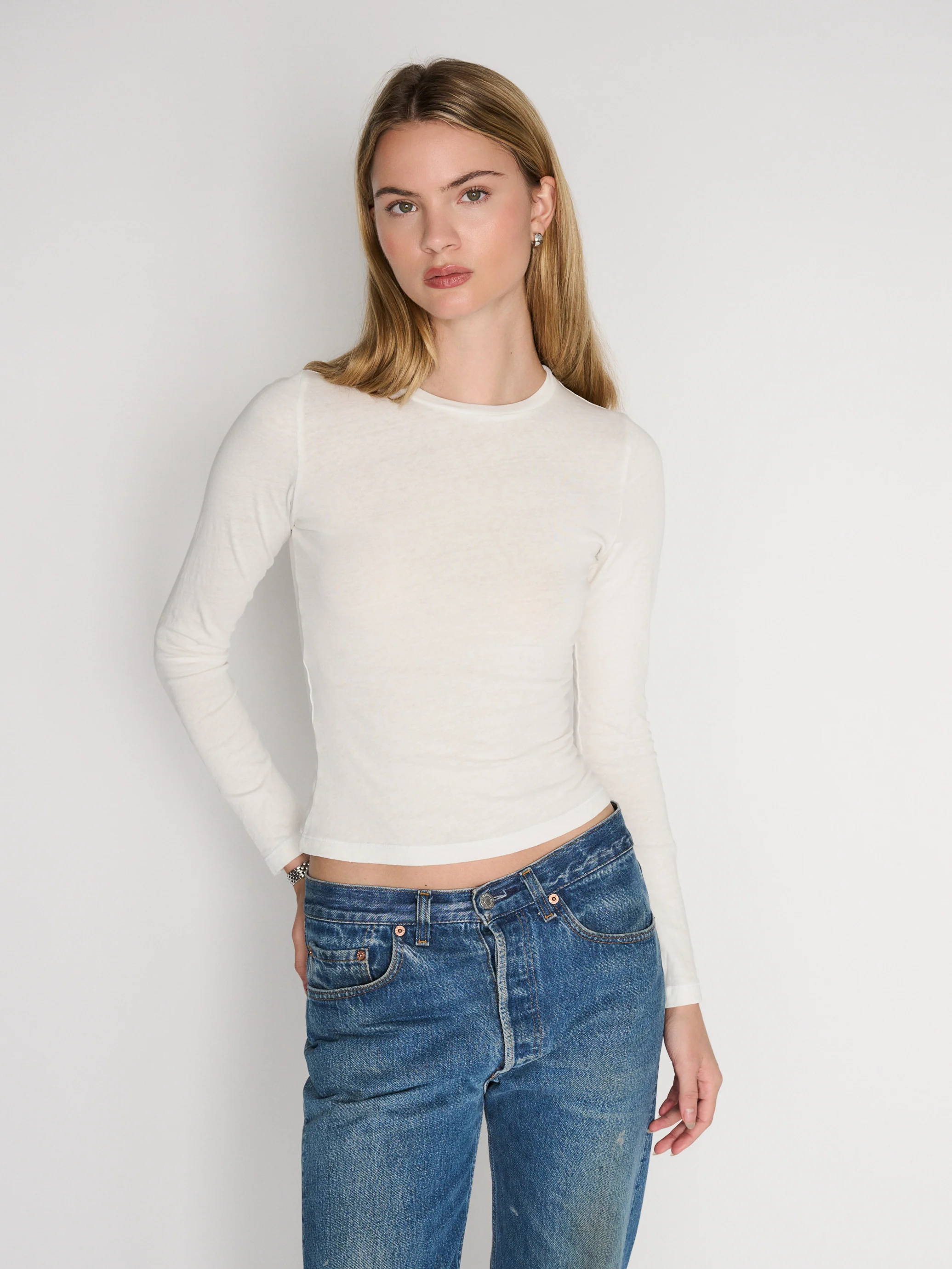 The long sleeve tee is crafted locally in LA using 100% cotton. This top features a classic crew neckline, slim full length body and fitted long sleeves.Â