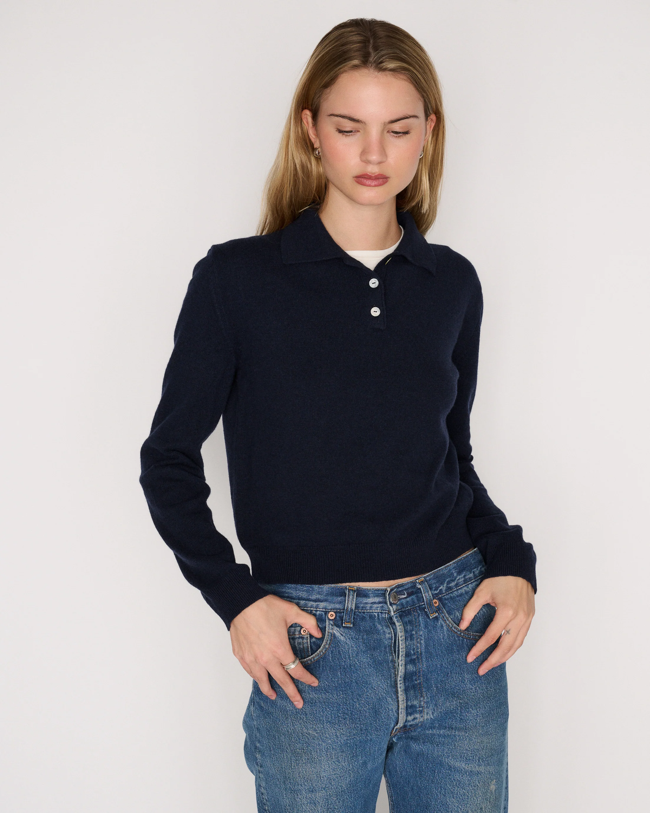 The RLT polo sweater is made from our signature cashmere wool blend and finished with mother of pearl buttons. Intended to have a mildly cropped and boxy fit, this sweater can be worn alone or layered. We recommend sizing up for a looser look. For more assistance, kindly email us at [email protected].