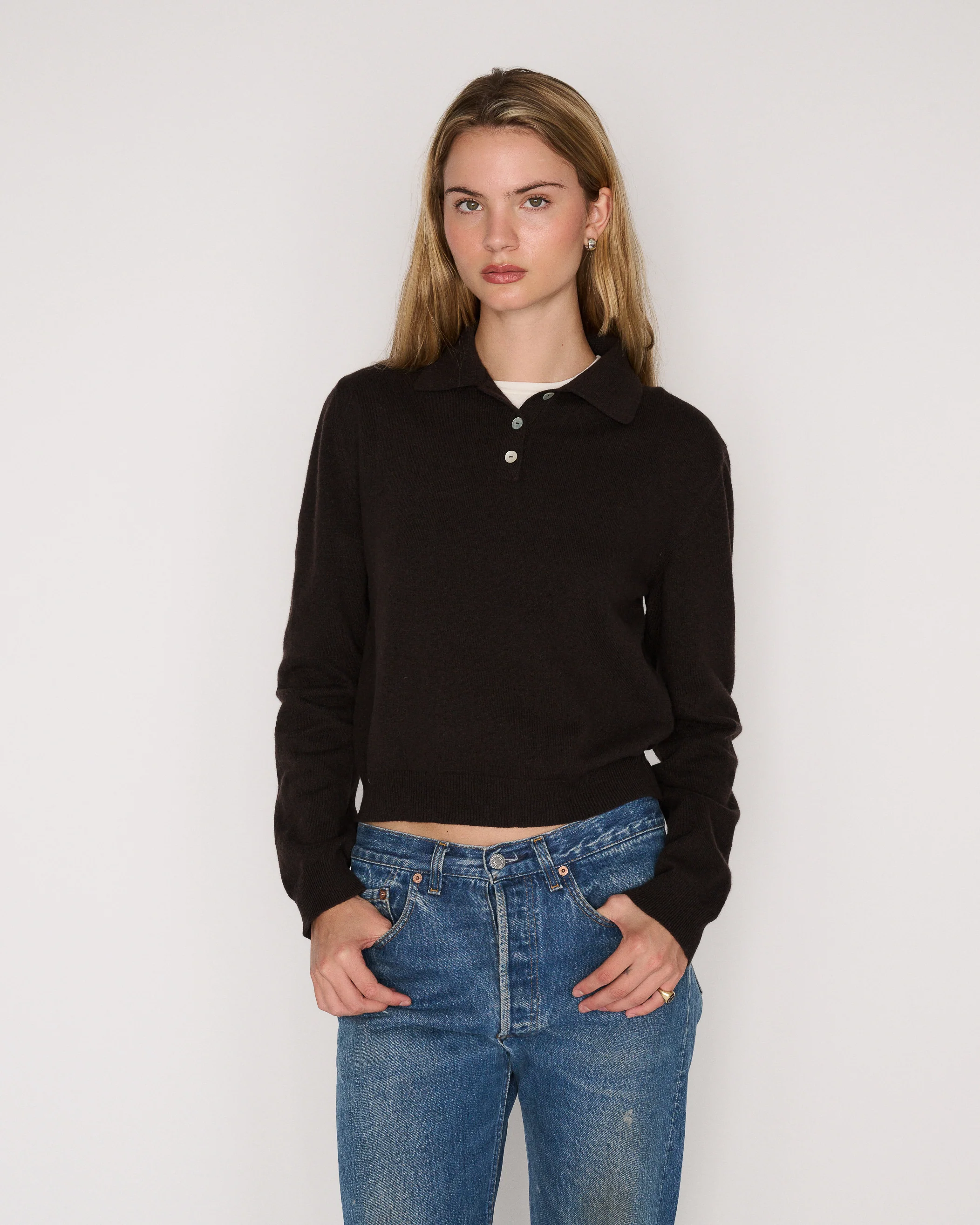 The RLT polo sweater is made from our signature cashmere wool blend and finished with mother of pearl buttons. Intended to have a mildly cropped and boxy fit, this sweater can be worn alone or layered. We recommend sizing up for a looser look. For more assistance, kindly email us at [email protected].