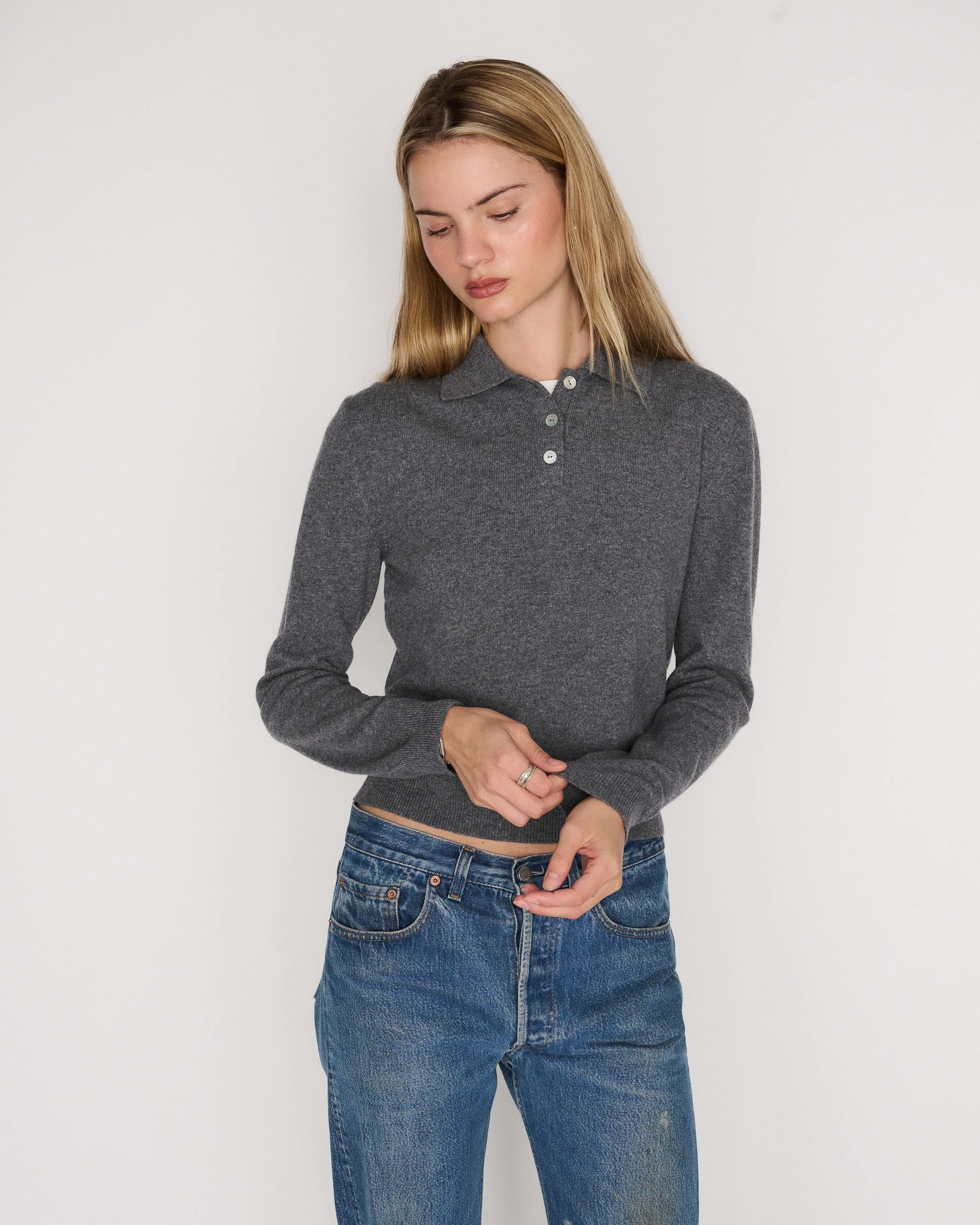 The RLT polo sweater is made from our signature cashmere wool blend and finished with mother of pearl buttons. Intended to have a mildly cropped and boxy fit, this sweater can be worn alone or layered.