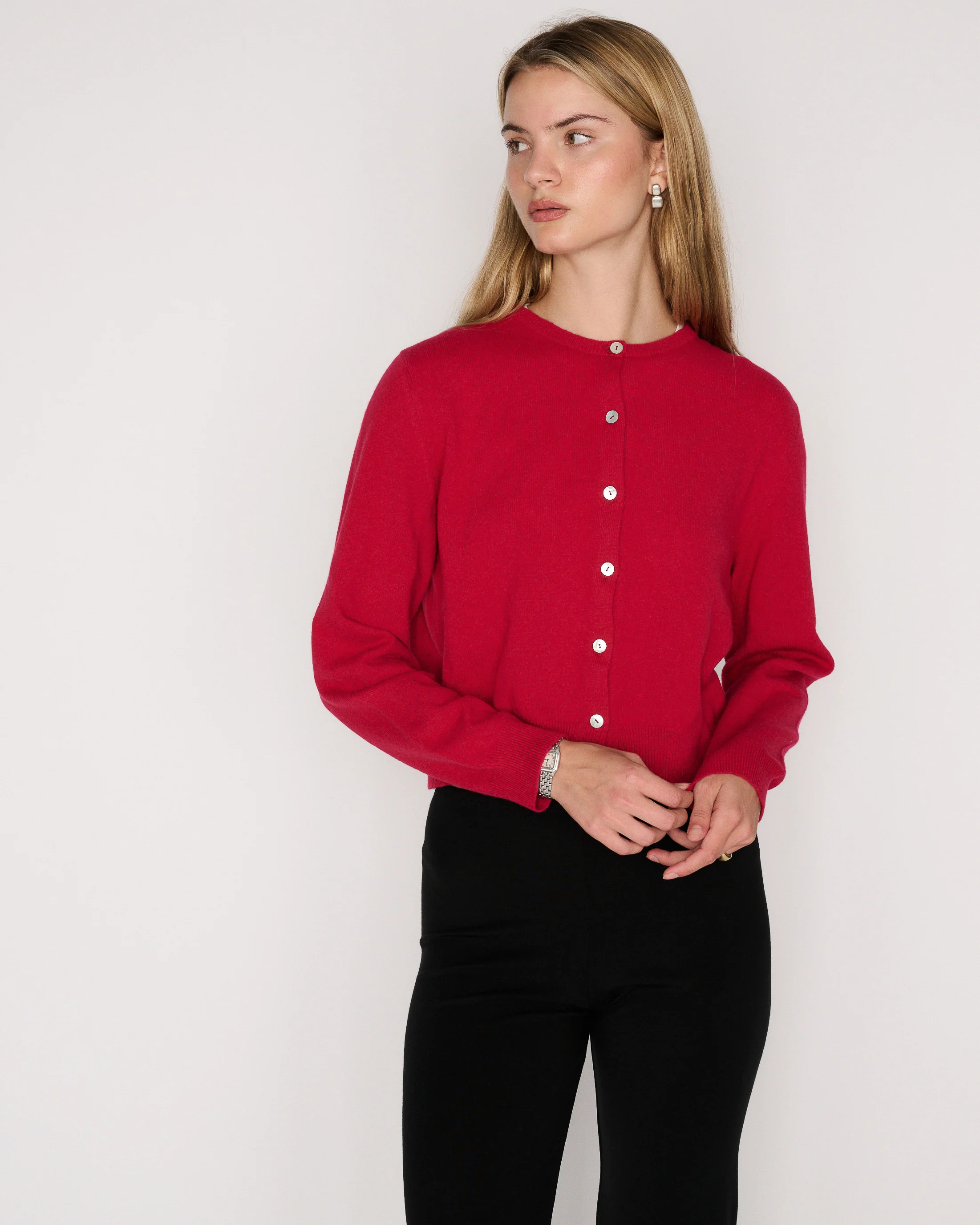 The Rachel sweater is a cashmere wool blend cardigan with mother of pearl buttons. Intended to have a mildly cropped and boxy fit. Wear it alone buttoned up or open. We recommend sizing up for a looser fit. For more assistance, kindly email us at [email protected].