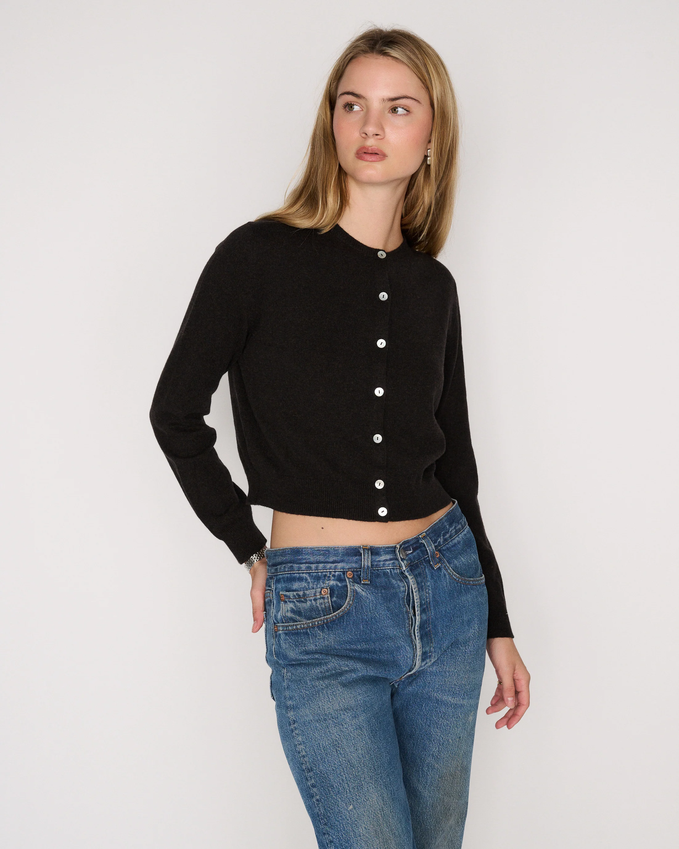 The Rachel sweater is a cashmere wool blend cardigan with mother of pearl buttons. Intended to have a mildly cropped and boxy fit. Wear it alone buttoned up or open. We recommend sizing up for a looser fit. For more assistance, kindly email us at [email protected].