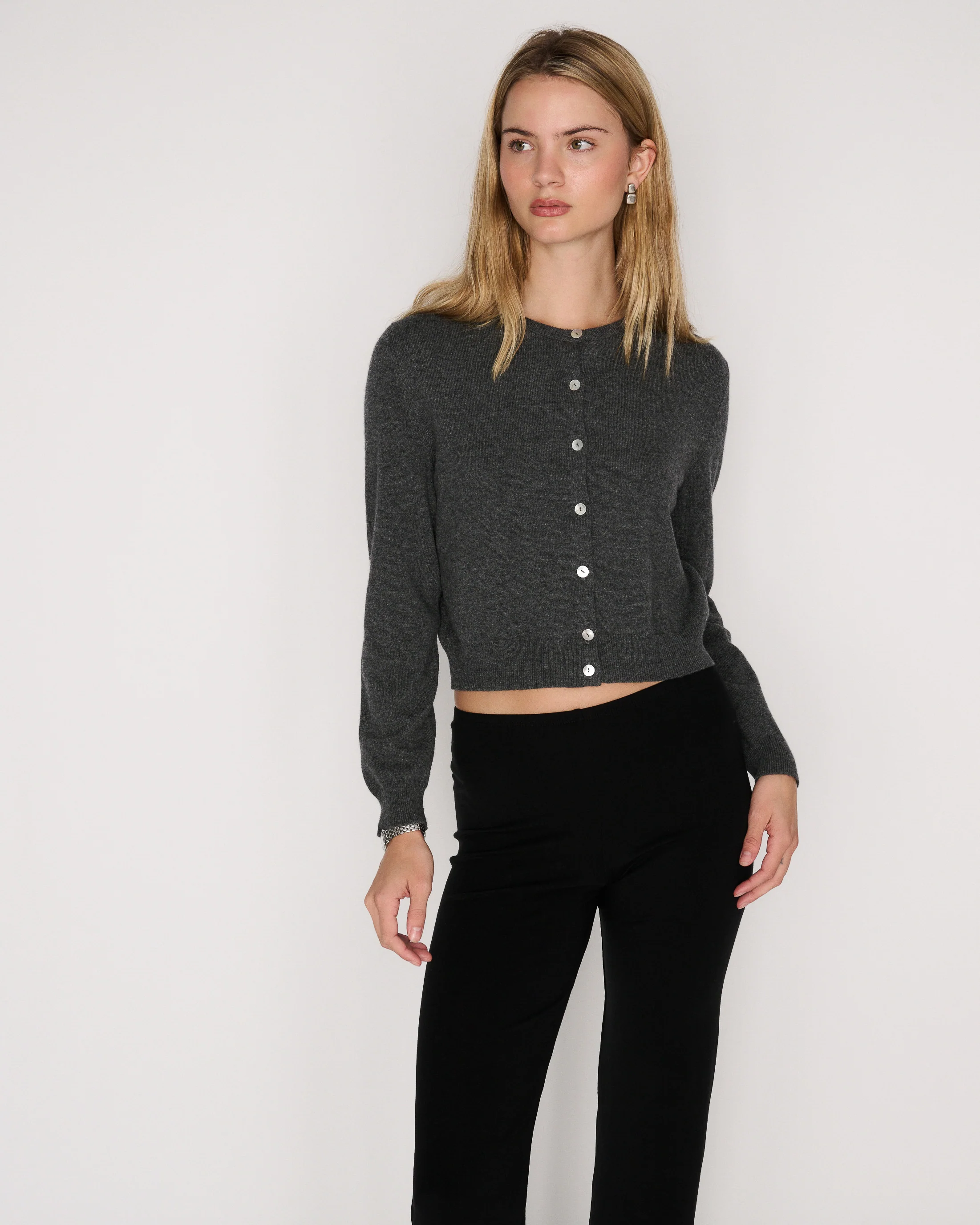 The Rachel sweater is a cashmere wool blend cardigan with mother of pearl buttons. Intended to have a mildly cropped and boxy fit. Wear it alone buttoned up or open. We recommend sizing up for a looser fit. For more assistance, kindly email us at [email protected].