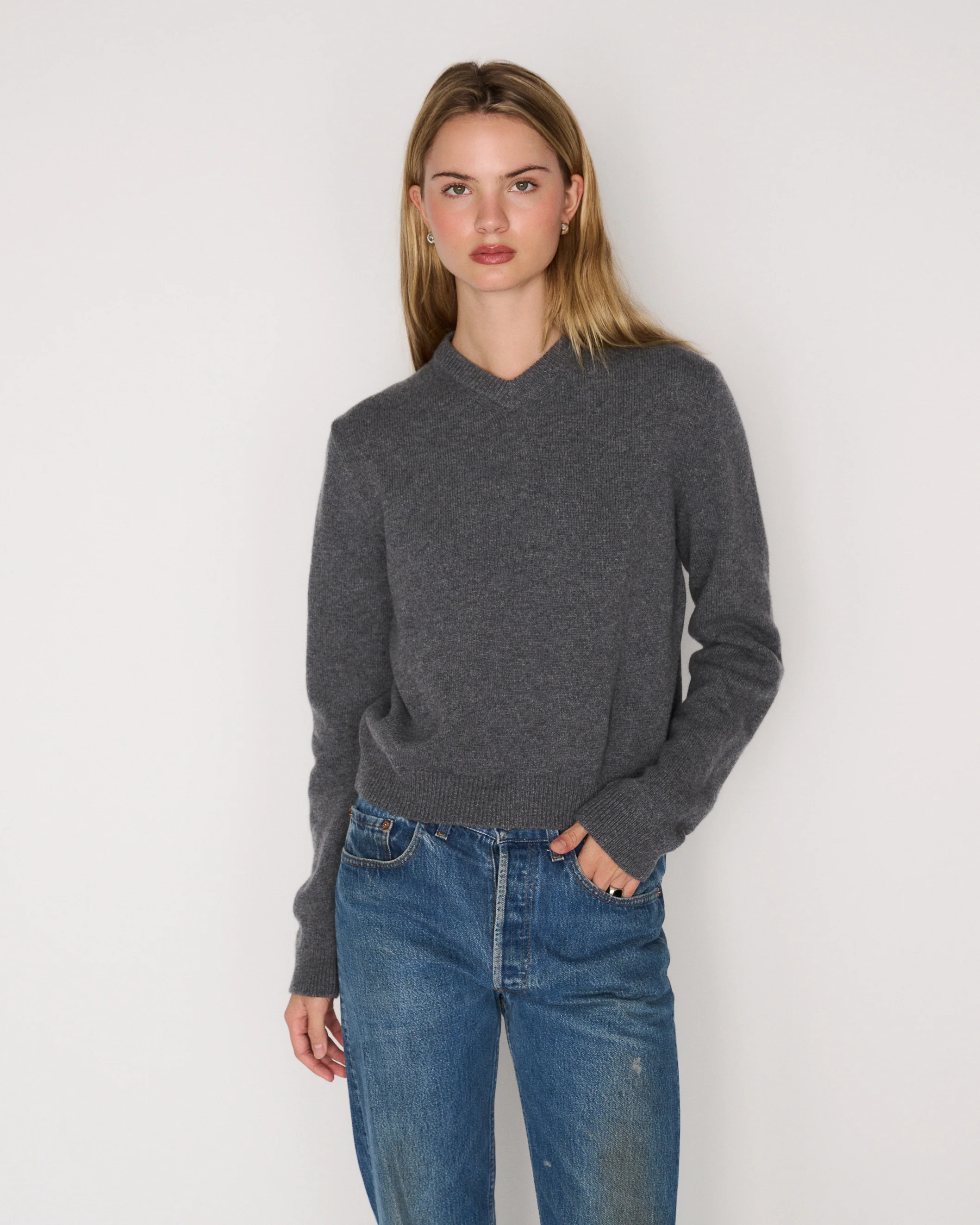 The RLT v-neck sweater is made from our signature cashmere wool blend locally in Los Angeles. With a 90's-inspired high v-neck and thick weave, this sweater can be worn alone or layered. We recommend sizing up for a looser look.