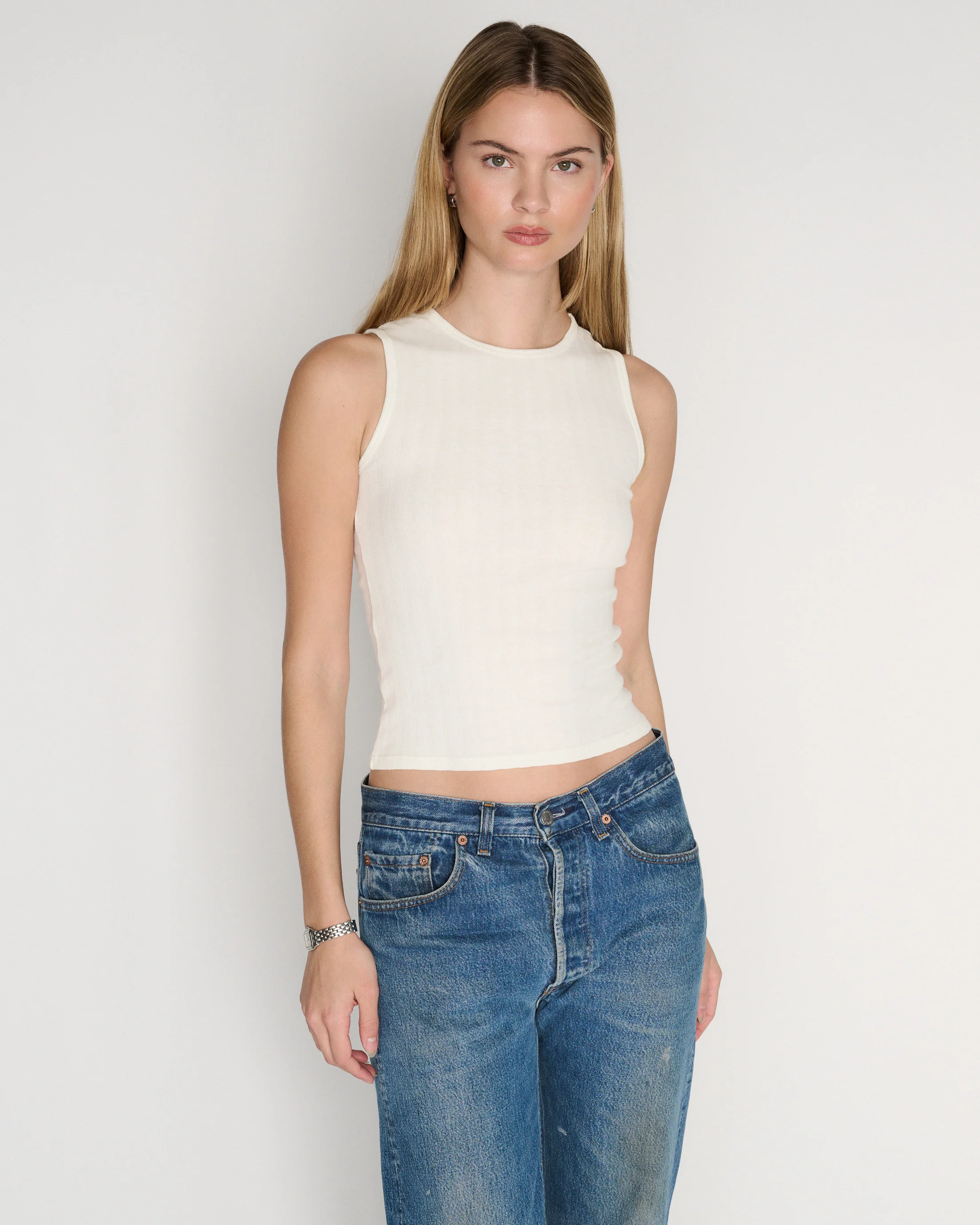 Layla Grace, 5'11" size 4, wears a size small. While true to size, this tank is fitted -- if you would like a looser fit or are between sizes, we recommend sizing up. For more assistance with fit, kindly email us at [email protected].